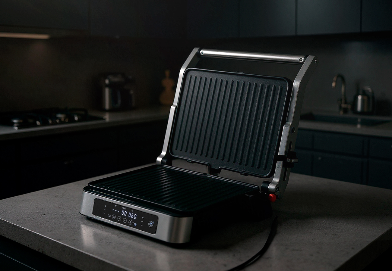 Рабочая поверхность гриля раскрывается на 180°, что позволяет готовить на двух панелях одновременно. Это удобно для приготовления овощей, мяса или морепродуктов для барбекю. Можно готовить бургеры: на одной панели обжарить котлеты, а на другой — булочки. Устройство может использоваться как пресс-гриль для обжаривания мяса, рыбы или овощей с двух сторон.