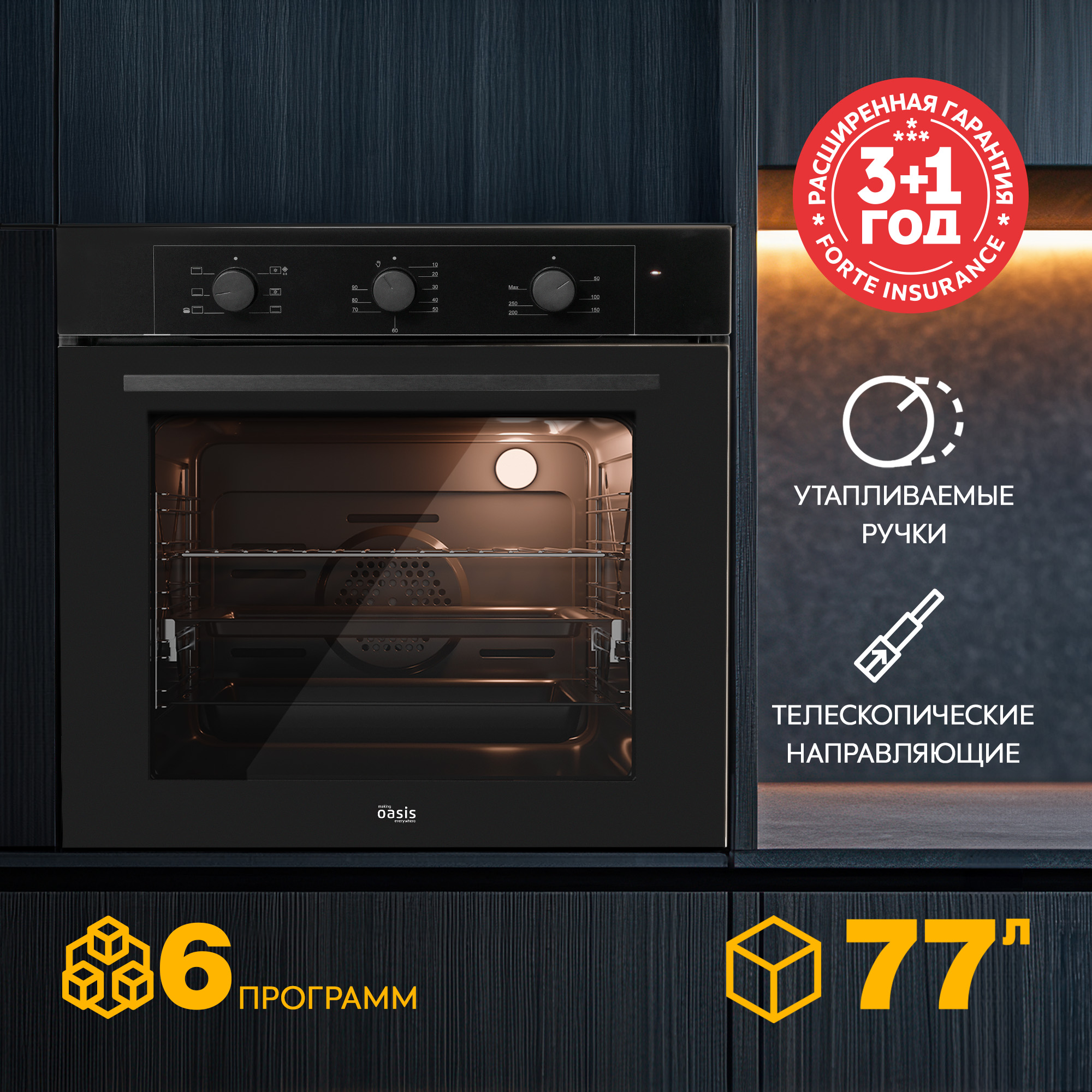 6 режимов работы открывают простор для кулинарных экспериментов. Механический таймер обеспечивает интуитивно понятное и надежное управление без сложных электронных настроек. С объёмом внутренней камеры 77 литров можно готовить несколько блюд одновременно для большого застолья. Конвекция обеспечивает равномерное приготовление благодаря циркуляции горячего воздуха по всей камере духовки. Гриль добавляет мясу, рыбе и овощам аппетитную золотистую корочку, а также быстро подрумянивает выпечку, придавая ей привлекательный вид.