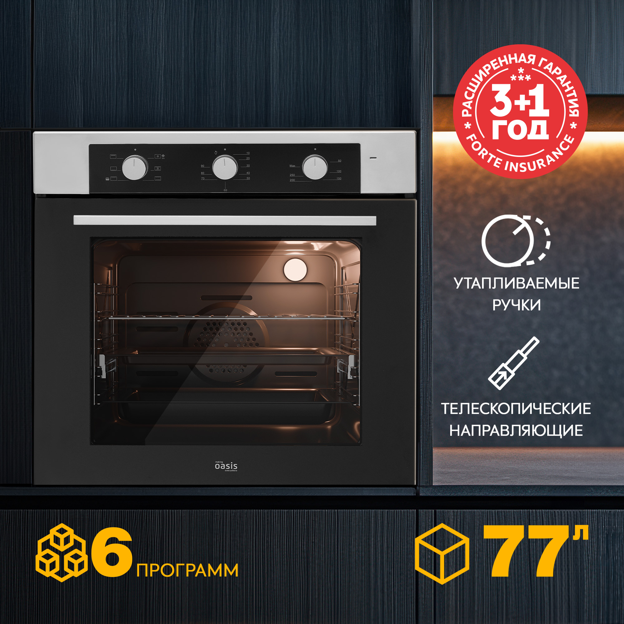 6 режимов работы открывают простор для кулинарных экспериментов. Механический таймер обеспечивает интуитивно понятное и надежное управление без сложных электронных настроек. С объёмом внутренней камеры 77 литров можно готовить несколько блюд одновременно для большого застолья. Конвекция обеспечивает равномерное приготовление благодаря циркуляции горячего воздуха по всей камере духовки. Гриль добавляет мясу, рыбе и овощам аппетитную золотистую корочку, а также быстро подрумянивает выпечку, придавая ей привлекательный вид.