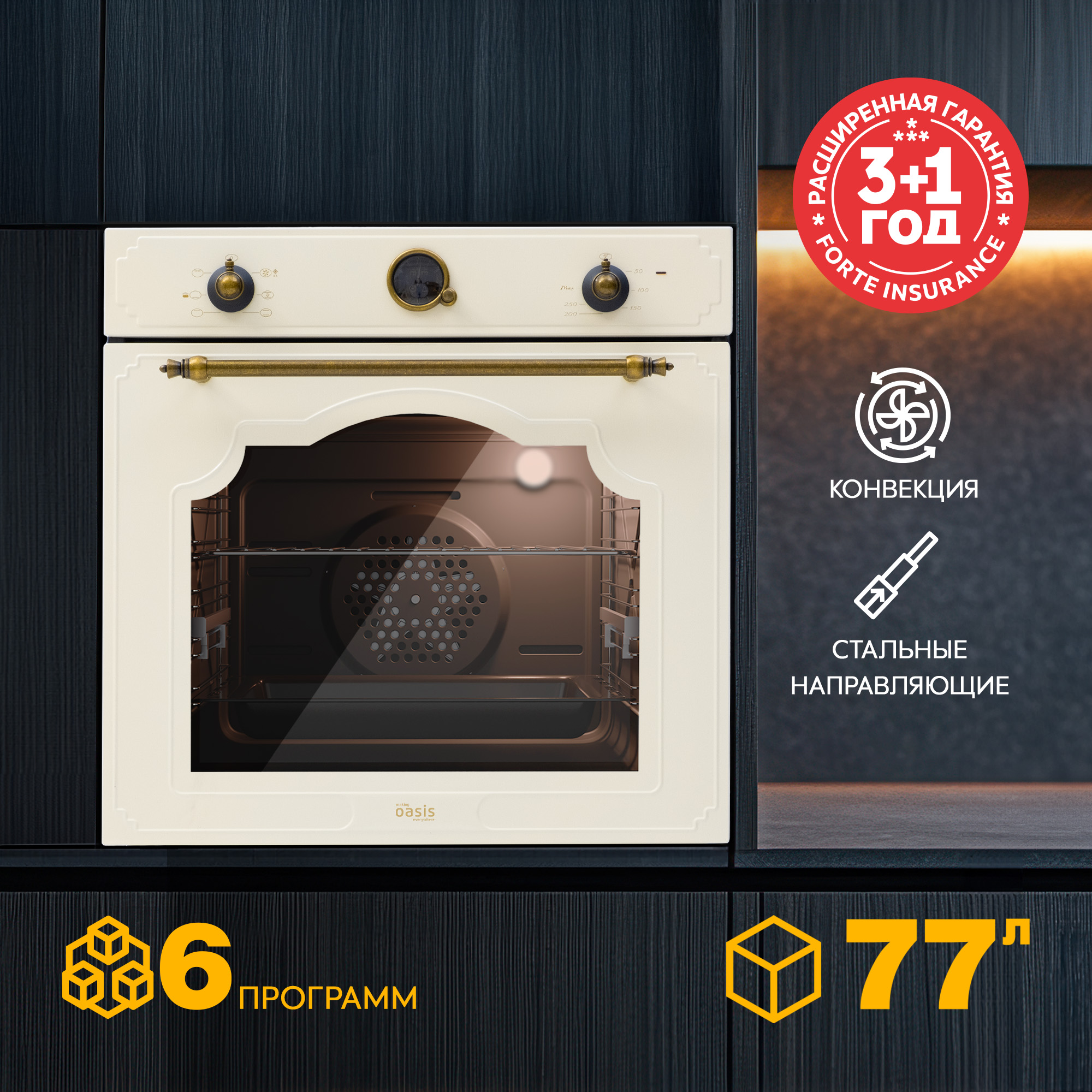 6 режимов работы открывают простор для кулинарных экспериментов. Аналоговый таймер с циферблатом обеспечивает интуитивно понятное и надежное управление без сложных электронных настроек. С объёмом внутренней камеры 77 литров можно готовить несколько блюд одновременно для большого застолья. Конвекция обеспечивает равномерное приготовление благодаря циркуляции горячего воздуха по всей камере духовки. Гриль добавляет мясу, рыбе и овощам аппетитную золотистую корочку, а также быстро подрумянивает выпечку, придавая ей привлекательный вид.