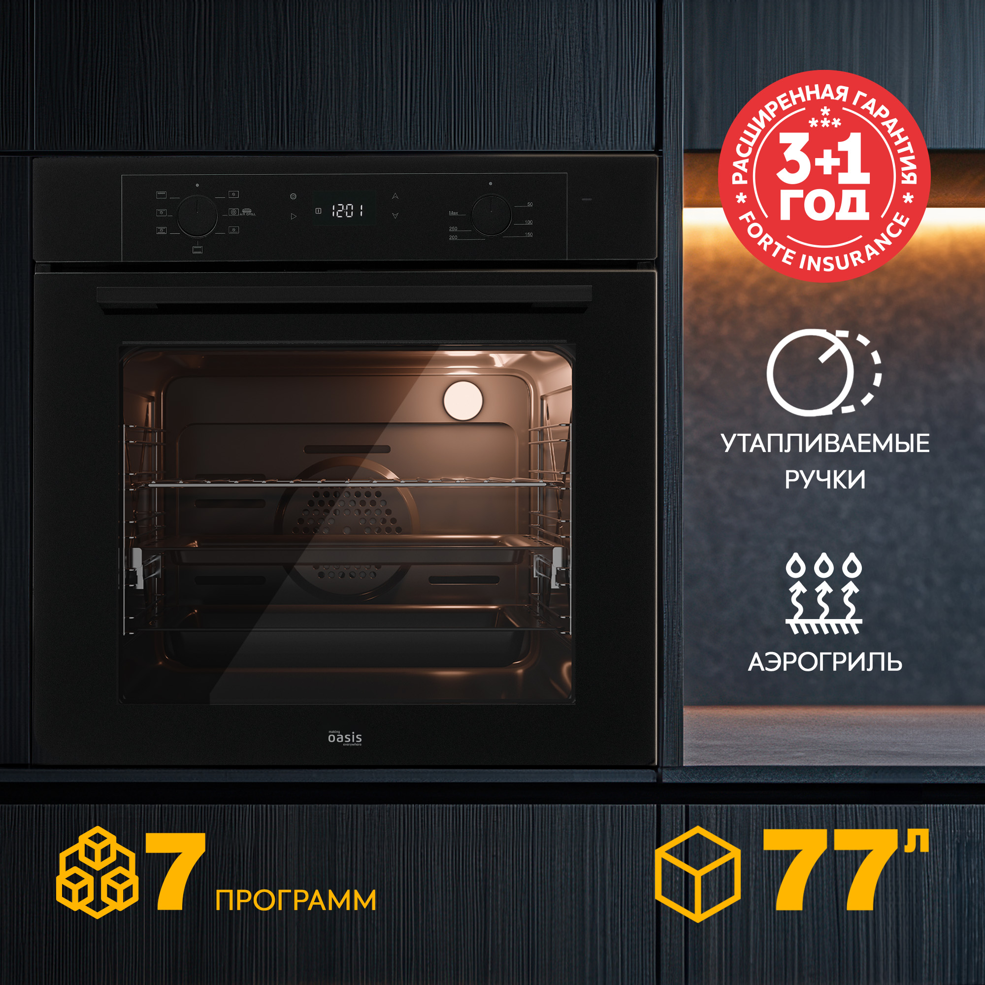 7 режимов работы открывают простор для кулинарных экспериментов. Сенсорный таймер предоставляет полный контроль над процессом готовки. С объёмом внутренней камеры 77 литров можно готовить несколько блюд одновременно для большого застолья. Конвекция обеспечивает равномерное приготовление благодаря циркуляции горячего воздуха по всей камере духовки. Гриль добавляет мясу, рыбе и овощам аппетитную золотистую корочку, а также быстро подрумянивает выпечку, придавая ей привлекательный вид. Аэрогриль обеспечивает быстрое и равномерное приготовление с хрустящей корочкой по всей поверхности блюда, как при жарке во фритюре, но с минимальным количеством масла.