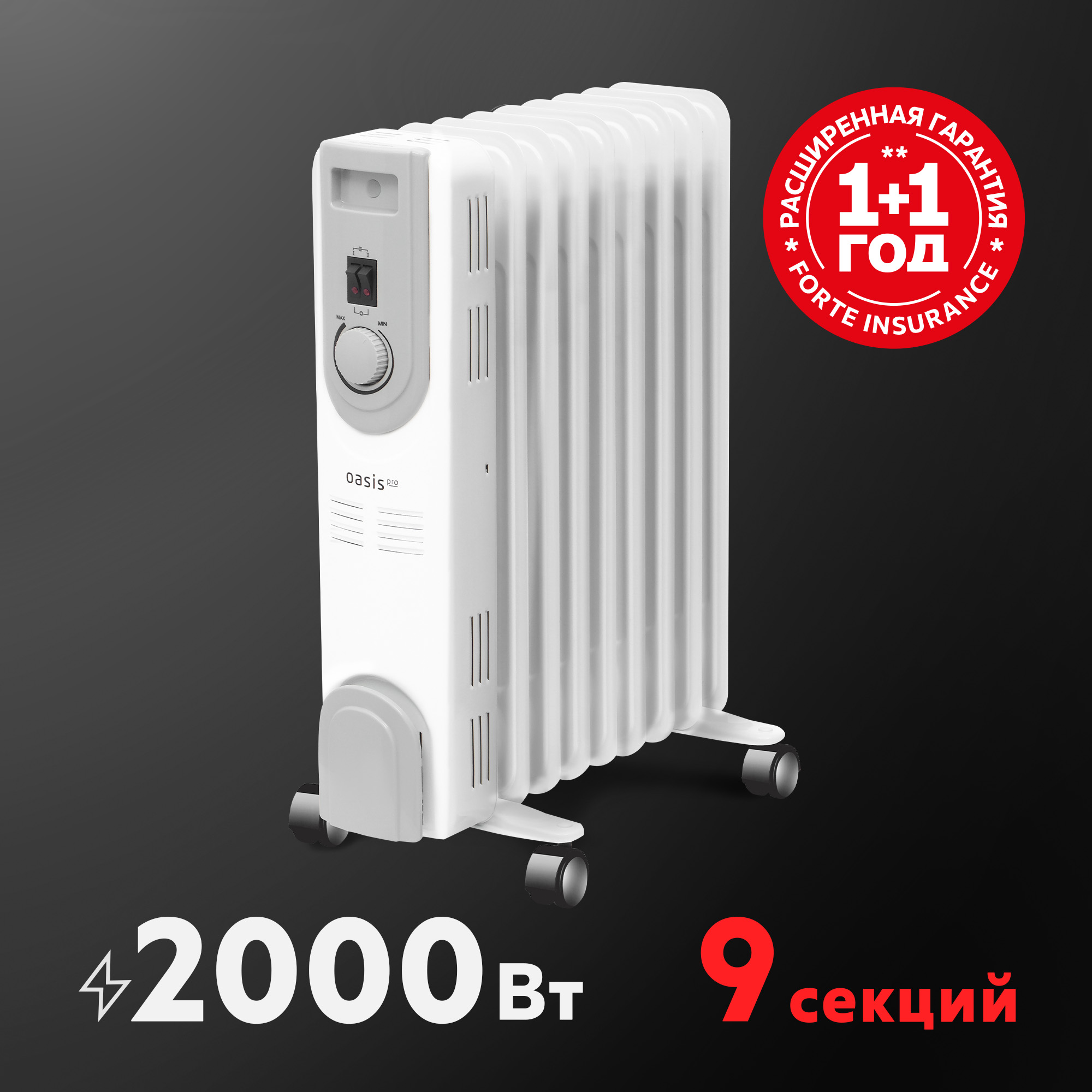 Масляный радиатор отопления Oasis Pro - электрический отопительный прибор, предназначенный для обогрева помещений. Внутри устройства находится минеральное масло, которое нагревается, а затем передаёт тепло через корпус радиатора. Это обеспечивает мягкий и равномерный прогрев воздуха в комнате. Масляные радиаторы подходят для использования дома, в квартире или офисе.