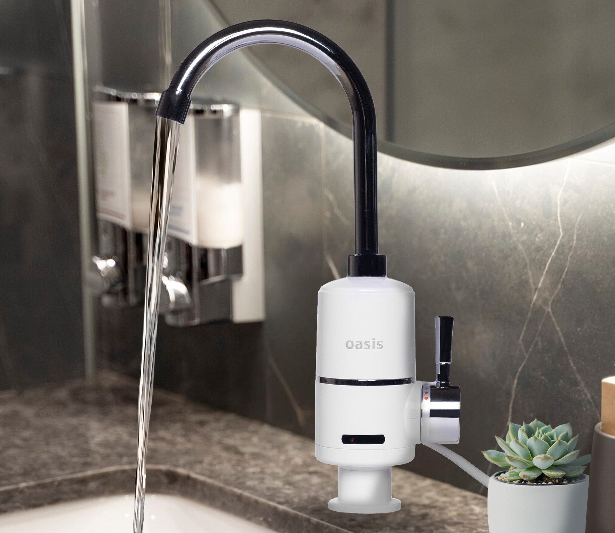 Вода нагревается за считанные секунды до комфортной температуры за счёт мощного нагревательного элемента. Устройство занимает минимум места и не требует отдельного бака для воды.
