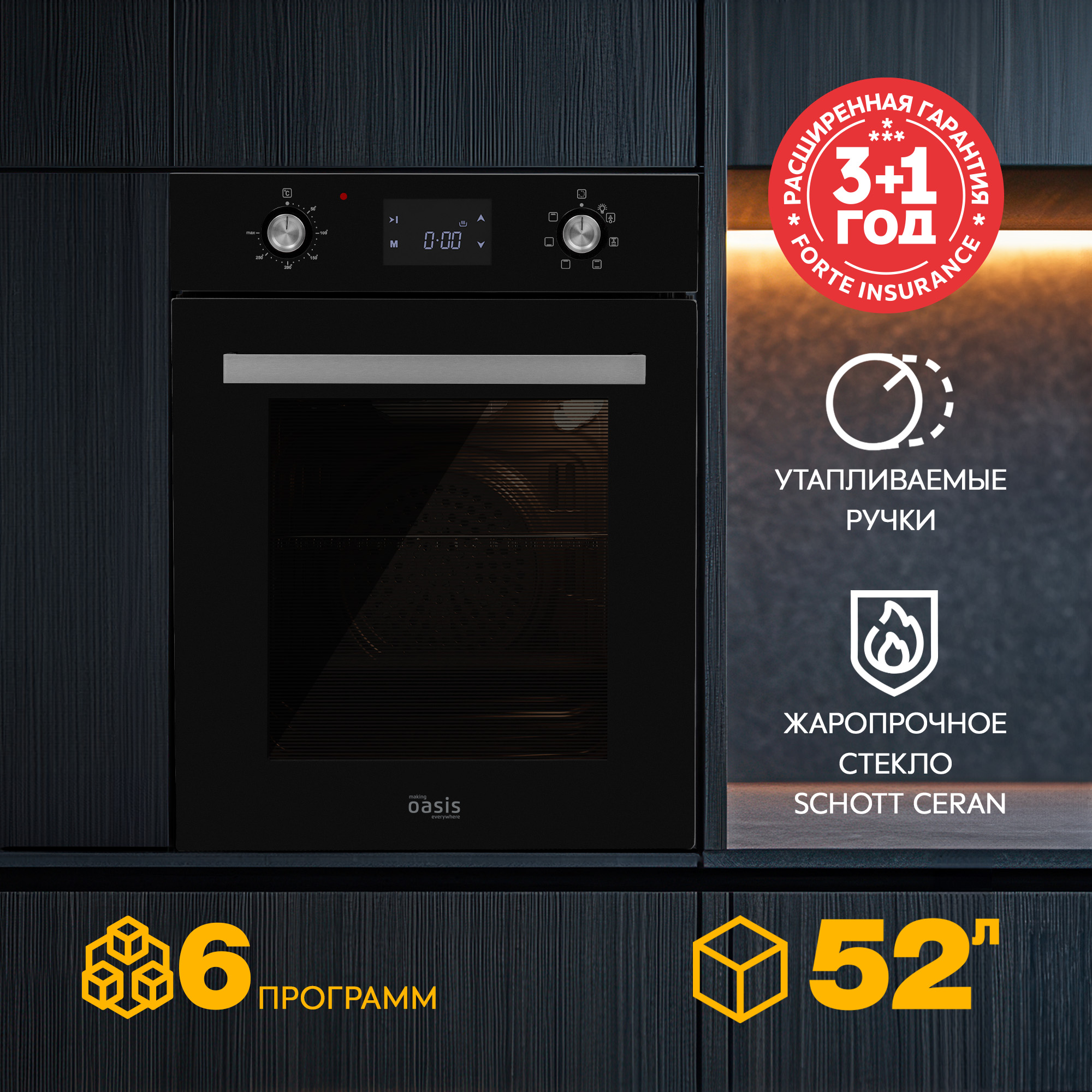 6 режимов работы открывают простор для кулинарных экспериментов. Сенсорный таймер предоставляет полный контроль над процессом готовки. С объёмом внутренней камеры 52 литра можно готовить несколько блюд одновременно для большого застолья. Конвекция обеспечивает равномерное приготовление благодаря циркуляции горячего воздуха по всей камере духовки. Гриль добавляет мясу, рыбе и овощам аппетитную золотистую корочку, а также быстро подрумянивает выпечку, придавая ей привлекательный вид.
