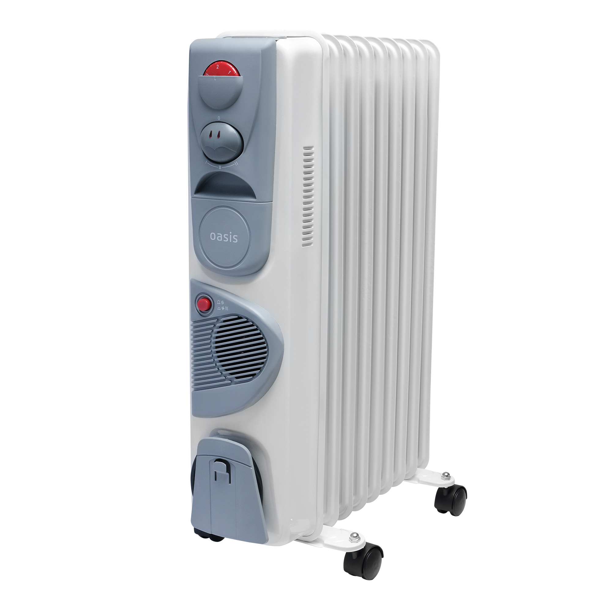 Масляный радиатор отопления с вентилятором Oasis - электрический отопительный прибор, предназначенный для обогрева помещений. Основу устройства составляет металлический корпус, заполненный минеральным маслом, и ТЭН, который нагревает масло. От классических моделей радиатор отличается наличием вентилятора, который при включении быстро распространяет тёплый воздух по комнате. После прогрева вентилятор можно отключить для бесшумного обогрева.