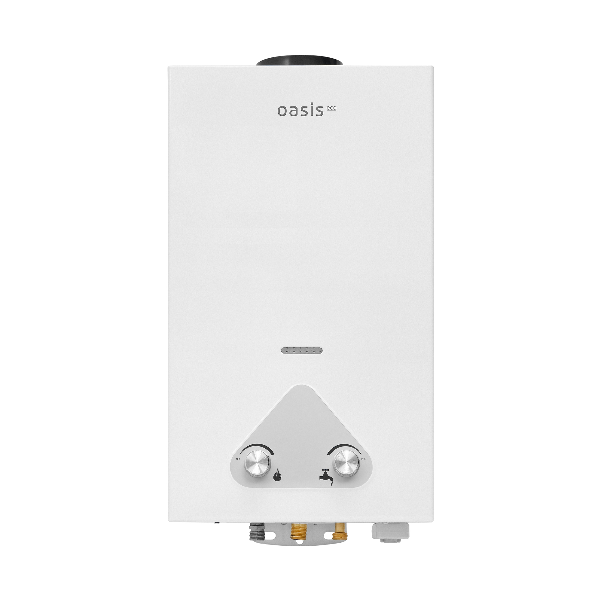 Газовый проточный водонагреватель Oasis Eco предназначен для горячего водоснабжения квартир, частных домов и коттеджей, оборудованных дымоходом. Принцип его работы достаточно прост: вода проходит через теплообменник прибора и моментально нагревается от сгорающего газа, поступая к потребителю уже горячей. Розжиг колонки происходит автоматически при открытии крана горячей воды. Прибор работает на природном газе. Имеет регулировку температуры воды и пламени газовой горелки.